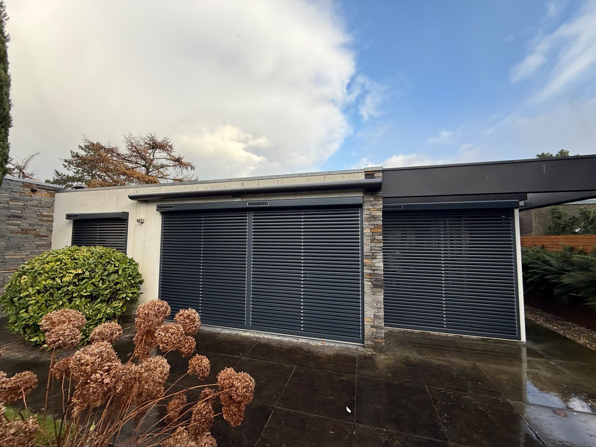 De klant koos voor een combinatie van rolluiken en rolluiken met kantelbare lamellen van het merk Bubendorff. Bij de bestaande woning plaatsten we rolluiken met kantelbare lamellen bij de woonkamer, keuken en andere leefruimtes om zowel de zon te kunnen blokkeren, doorzicht naar buiten te kunnen creëren en de warmte beter te laten ventileren. De rolluiken met kantelbare lamellen geven een luxe uitstraling, waardoor het ook esthetisch bijdraagt aan de woning.